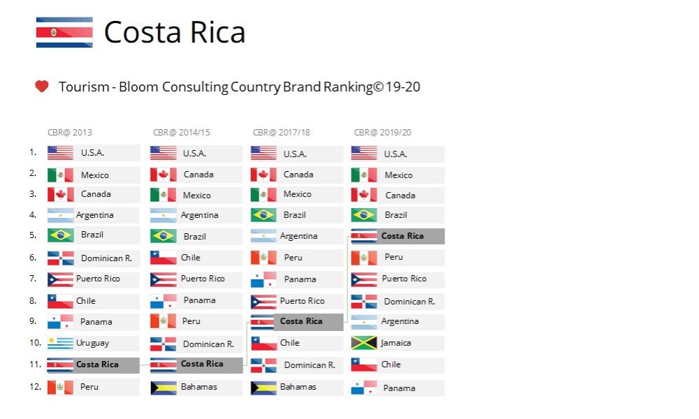 Nevertheless, throughout the editions of Bloom Consulting Country Brand Ranking© – another methodology used to measure the performance of this Country Brand -, the evolution has always been towards growth. Regarding Tourism, Costa Rica has made a significant leap since 2013, rising from 11th place to 5th place in the region, thus reaching the Top 10 thanks to an increase in tourism receipts, online performance, and effective communication strategy (Rating CBS: AA). Step by step, it is about to rise to the Top 30 worldwide.