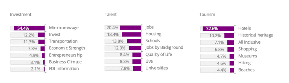 The first source of results we will look at is the comparative volume of searches for a place and its benchmarks by dimension. We can conclude whether a place is more or less relevant by sheer mass of searches within each area of focus. How so? If a place has in its mind that it is well-known for its tourism offer, stakeholders may be overestimating their competitiveness in terms of real demand. Search volume would determine whether competitors are doing better in terms of actual interest and engagement and furthermore how they are perceived. International perceptions could confirm that global markets think highly of a place, but search volume analysis will show whether the global community is proactively interested, or in other words, putting their search where their mouth is.