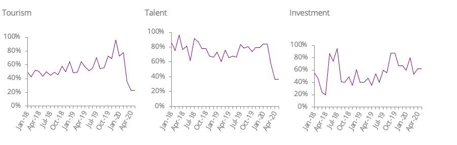 COVID-19 waved goodbye to most trending behaviours projected for 2020. We have seen in certain cases however, the dimensions of tourism and talent have nearly fallen off the chart in terms of searches around March and April, but another story could be told for investment. While investment patterns are often more erratic, the spontaneity in this year’s trend was that search volume was only slightly affected, if at all (search results are limited to specific countries, regions or cities and not a global average). Reckoningthe possibility that this phenomenon has anything to do with the seamlessness of online services offered by a country, region or city for FDI, we’d venture to say that there are models available in the global market which other place leaders would benefit from to maintain inflow of investment during restrictive times.