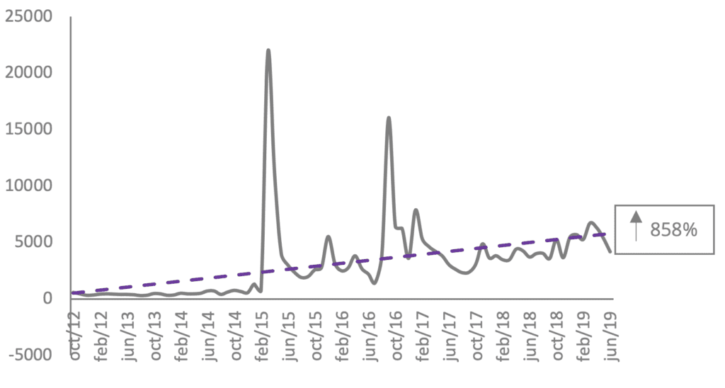 Pero la métrica más importante de cómo la estrategia de Marca País de Costa Rica está teniendo un efecto heredado es cómo las búsquedas se dispararon después de la implementación de políticas de energía renovable. ¡El crecimiento promedio en los últimos dos años saltó 858%! Como puede ver en el gráfico a continuación, después de noviembre de 2014, el período de implementación, el número de búsquedas de «Energía renovable» alcanzó un pico sin precedentes. Un fuerte indicador de que la estrategia de marca país de Costa Rica puso al país en el mapa «verde».