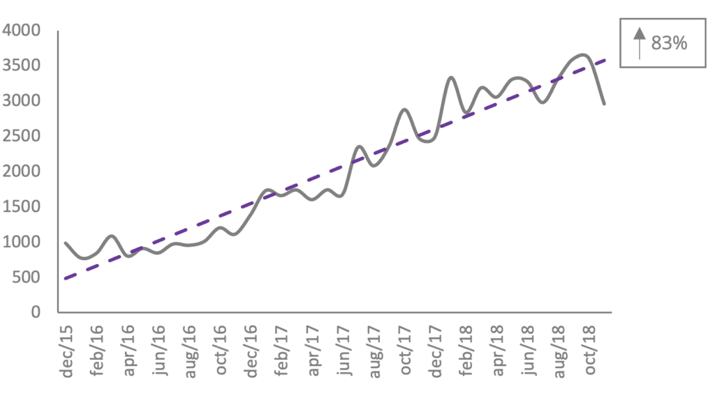 Cuando se trata de Estonia, es el país de más rápido crecimiento en Europa en los últimos tres años, para búsquedas relacionadas con «Emprendimiento«, una marca claramente vinculada a la Idea Central de Estonia. Con un crecimiento promedio del 83% en Digital Demand – D2©, el crecimiento de Estonia es diez veces mayor que el crecimiento promedio mundial (8.7%).