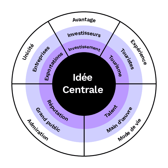 Le modèle de taxonomie des marques de villes de Bloom Consulting © sert de guide aux gestionnaires de marque pour raconter la bonne histoire aux bons publics, en se basant sur les 12 éléments de perception qui constituent la perception d’une ville.