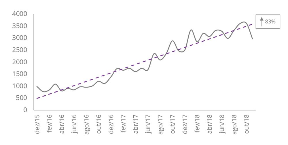 Mas a métrica mais importante de como a estratégia de Marca País da Costa Rica está a construir um legado é como as pesquisas dispararam após a implementação de políticas de energia renovável. O crescimento médio nos últimos dois anos ascendeu 858%! Como se pode ver no gráfico em baixo, após novembro de 2014 – o período de implementação – o número de buscas por “Energias Renováveis” atingiu um pico sem precedentes. Um forte indicador de que a estratégia da Marca País da Costa Rica colocou o País no mapa “verde”.