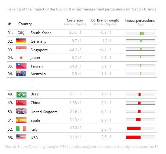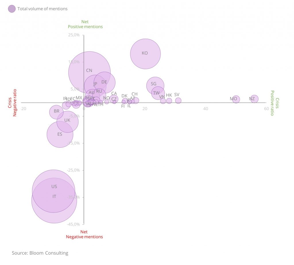 The study revealed that the Countries with the worst performance received more attention than the Countries with better crisis management. This means that negative perceptions have a greater impact than positive ones. Thus, South Korea, Germany and Singapore were the Countries that reinforced their positive reputation thanks to good crisis management, while the USA, Italy and Spain had a greater negative impact on their brand, being considered as the worst managers of the pandemic. Furthermore, the US has a negative impact four times greater than the positive impact of South Korea.